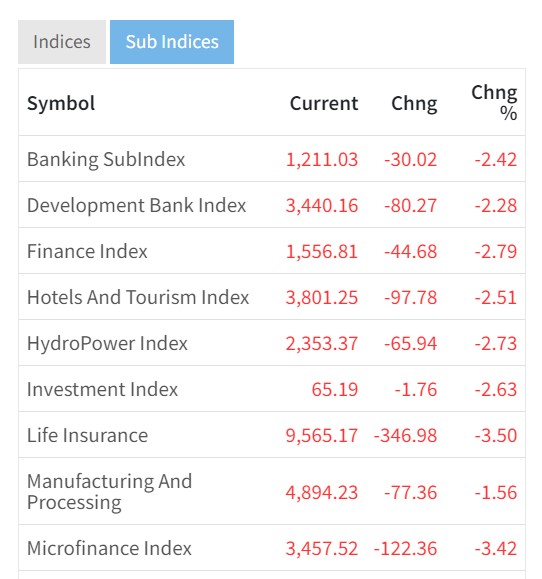 नेप्सेमा रहेका सबै उपसूचक राताम्य भएका छन् । सर्वाधिक जीवन बीमा उपसूचक र हाइक्रोफाइनान्स उपसूचक घट्न पुगेको छ । धितोपत्र दोेस्रो बजारमा बीमा कम्पनी र लघुवित्त संस्थाहरुमा सरकारले आगामी आवको बजेटमार्फत मर्जर तथा एक्विजिशन र एफपीओ निष्काशनमा उक्त खालको व्यवस्था गरेसँगै यी दुई उपसूचक सर्वाधिक घट्न पुगेको हो ।