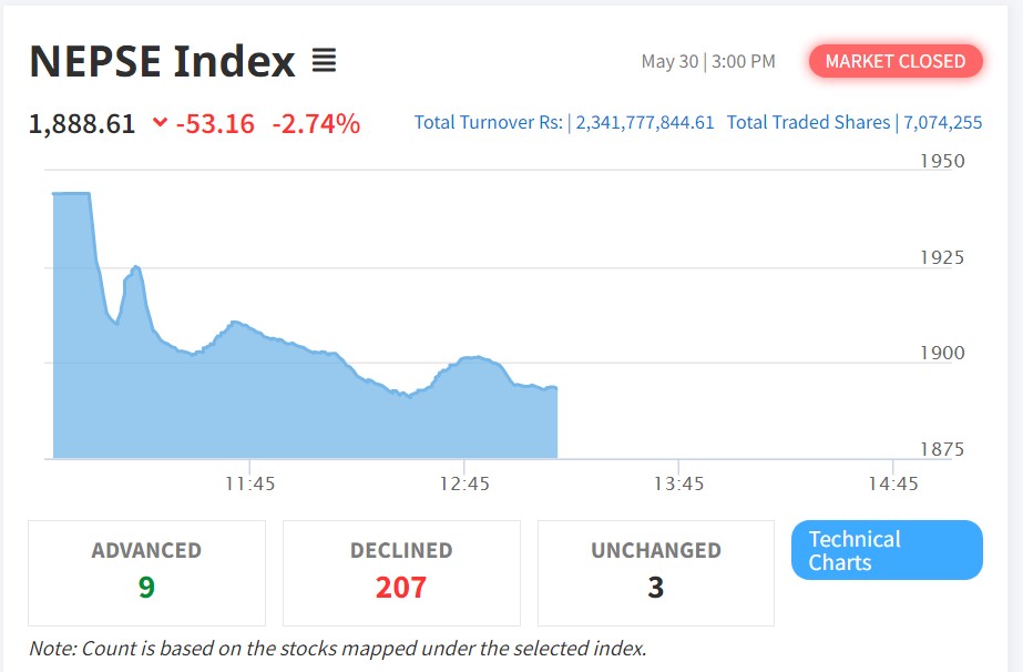 काठमाडौं । बजेट घोषणापछि शेयरबजारमा आज उच्च अंकको गिरावट आएको छ । नेप्से सूचक ५३ अंकले घटेर १८८८ विन्दुमा झरेको छ ।