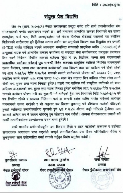 सरकारबाट प्रस्तुत बजेटप्रति हामी लगानीकर्ताका संघसंगठनको गम्भीर ध्यानाकर्षण लगानीकर्ताहरुको रहेको छ । लगानीकर्ताका संघ संगठनहरुले विज्ञप्ति जारी गर्दै ५ प्रतिशत र ७.५ प्रतिशत पुँजीगत लाभ करलाई अन्तिम कर कायम नगरे सेयर बजारका लाखौं लगानीकर्ताहरू आन्दोलनमा उत्रन बाध्य हुने जनाएका छन् ।