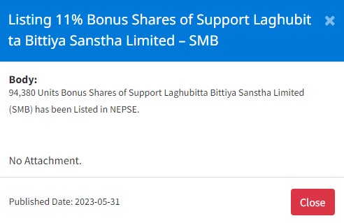 काठमाडौं । नेप्सेमा एक कम्पनीको बोनस शेयर सुचीकृत भएको छ । नेप्सेमा आज सपोर्ट लघुवित्तको ११ प्रतिशत बोनस बापतको ९४ हजार ३ सय ८० कित्ता बोनस शेयर नेप्सेमा सुचीकृत भएको हो ।