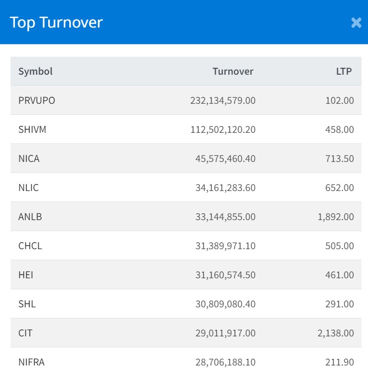 प्रभु बैंकसहित यी हुन् आज सर्वाधिक कारोबार हुने टप १० कम्पनी