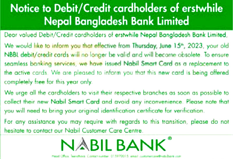 काठमाडौं । नबिल बैंक लिमिटेडले साविक नेपाल बंगलादेश बैंक लिमिटेडका ग्राहकहरुलाई सूचना जारी गरेको छ । बैंकले साविक नेपाल बंगलादेश बैंकका डेबिट।क्रेडिट कार्ड प्रयोगकर्ताहरुलाई यहि जेठ ३२ गतेदेखि लागू हुनेगरी पुराना डेबिट।क्रेडिट कार्डहरु मान्य नहुने जनाएको छ ।