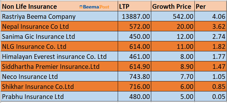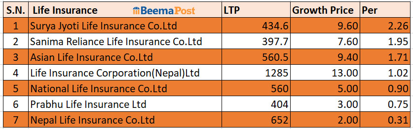 साता कारोबारको अन्तिम दिन लाइफ इन्स्योरेन्स कर्पोरेशन (नेपाल) को १.०२ प्रतिशतले बढेर १२८५ रुपैयाँ, नेशनल लाइफको ०.९० प्रतिशतले बढेर ५६० रुपैयाँमा र प्रभु इन्स्योरेन्सको ०.७५ प्रतिशतले बढेर ४०४ रुपैयाँमा अन्तिम कारोबार भएको छ ।