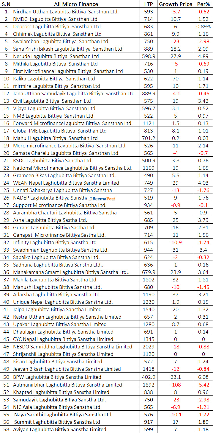 यो साता १२ लघुवित्तको शेयर मूल्य १ हजार माथि, १६ को शेयर मूल्य घट्यो, अन्यको अवस्था कस्तो ?