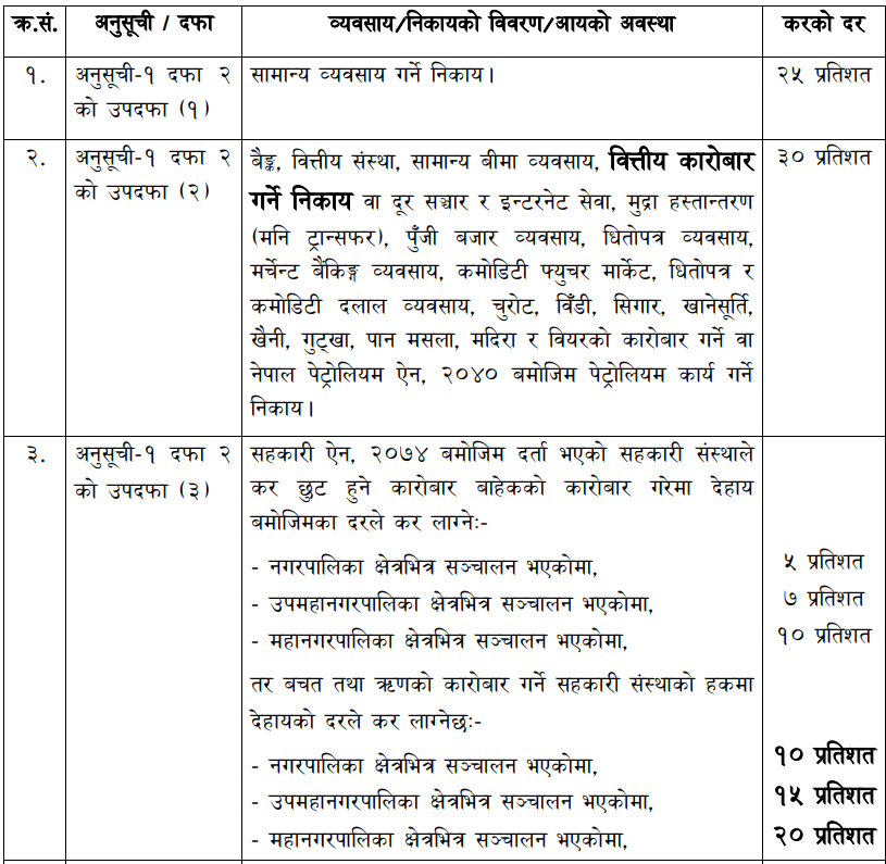 बैङ्क, वित्तीय संस्था, सामान्य बीमा व्यवसाय, वित्तीय कारोबार गर्ने निकाय वा दूर सञ्चार र इन्टरनेट सेवा, मुद्रा हस्तान्तरण ( मनि ट्रान्सफर), पुँजी बजार व्यवसाय, धितोपत्र व्यवसाय, मर्चेन्ट बैंकिङ्ग व्यवसाय, कमोडिटी फ्युचर मार्केट, धितोपत्र र कमोडिटी दलाल व्यवसाय, चुरोट, बिँडी, सिगार, खानेसूर्ति, खैनी, गुट्खा, पान मसला, मदिरा र वियरको कारोबार गर्ने वा नेपाल पेट्रोलियम ऐन, २०४० बमोजिम पेट्रोलियम कार्य गर्ने निकाय गर्न ३० प्रतिशत करको व्यवस्था गरिएको छ ।