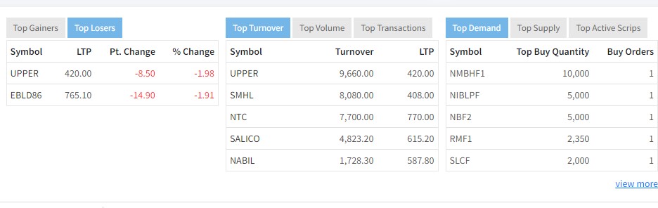 यस अवधिमा सुपर मादीको शेयर र नेपाल टेलिकमको शेयर टप गेनरमा देखिएको छ। सर्वाधिक कमाउनेमा अपर तामाकोशी, सुपर मादी, नेपाल टेलिकम, सलिको र नबिल बैंकको शेयर कारोबार भएको देखिएको छ।