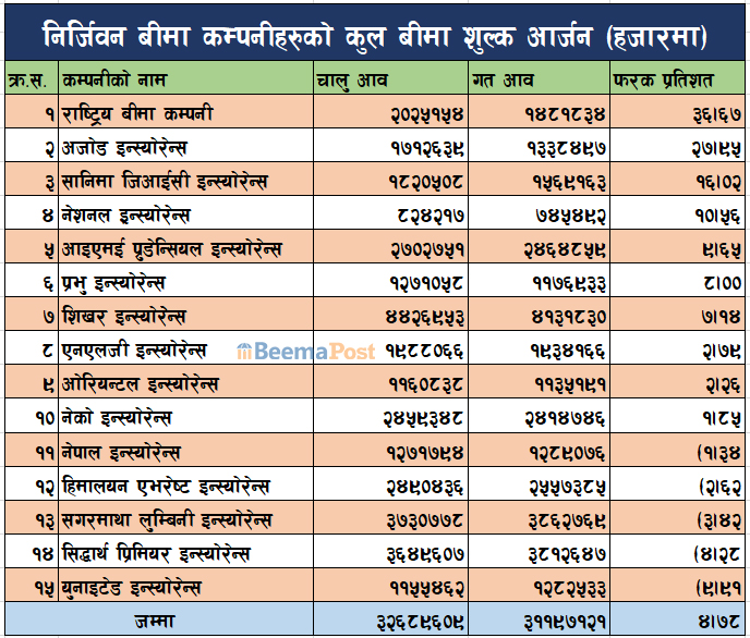 निर्जीवन बीमा कम्पनीहरुको बीमा व्यवसाय ४.७८ प्रतिशतले बढ्यो, पाँच कम्पनीको व्यवसाय घट्यो (सूचीसहित)