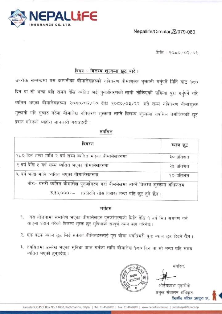 कम्पनीले बीमालेखहरुमा जेठ १० गतेदेखि असार २२ गतेसम्म ब्यतित भएका बीमालेखहरु रकम भुक्तानी गरी सुचारु गरेमा बीमालेख नविकरण शूल्कमा लाग्ने व्याजमा छुट दिा लागेको एक सूचना मार्फत जानकारी दिएको छ ।