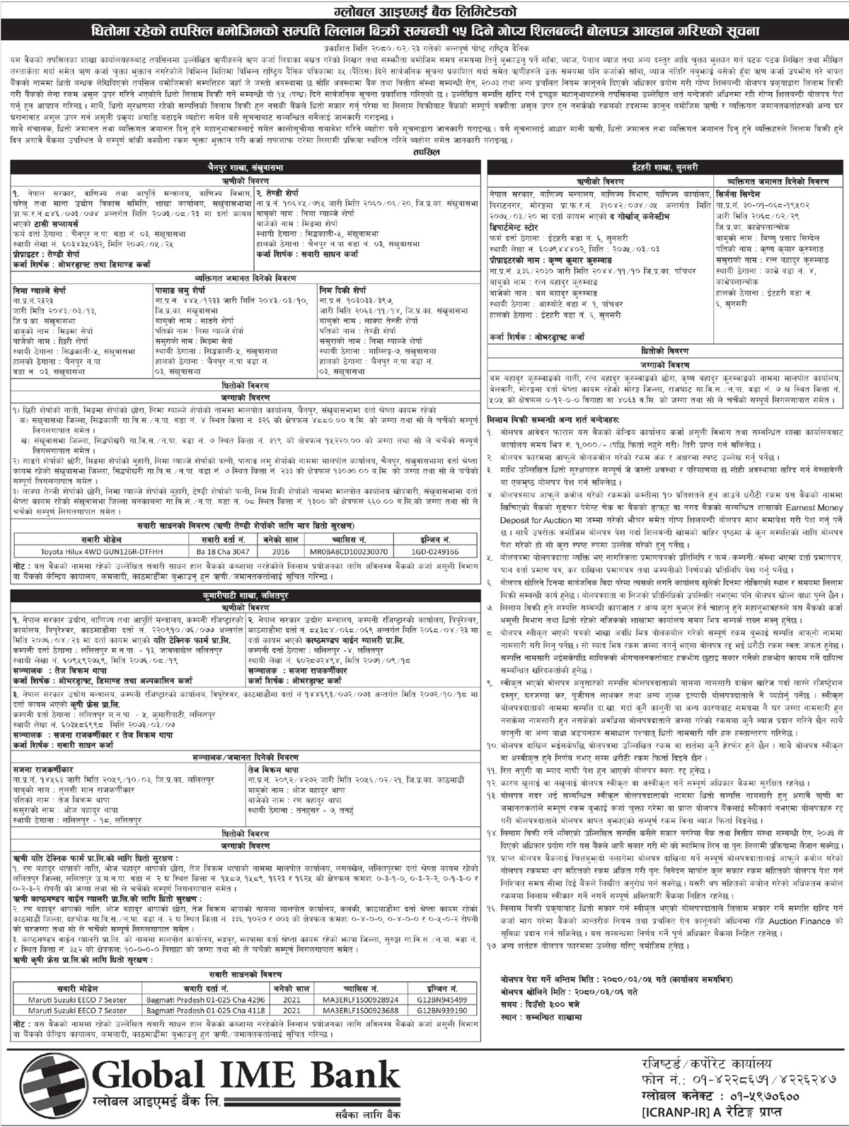 तीन शाखाका ऋणीहरुको सम्पत्ति लिलाम गर्दै ग्लोबल आइएमई बैंक