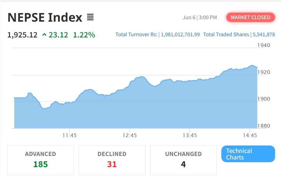 आज नेप्सेमा सूचीकृत २६९ कम्पनीको ५५ लाख ४१ हजार ८७८ कित्ता शेयर किनबेच हुँदा एक अर्ब ९८ करोड १० लाख रुपैयाँमाथिको कारोबार भएको छ । नेप्सेमा रहेका सबै उपसूचकमा आज हरियाली छाएको छ । सर्वाधिक होटल तथा पर्यटन उपसूचक ५.६७ प्रतिशत र निर्जीवन बीमा उपसूचक ४.६४ प्रतिशतले बढेको छ ।