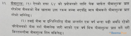 प्राधिकरणले जारीको गरेको सो नियम अनुसार बीमा कम्पनीहरुले चेक मार्फत बीमाशूल्क प्राप्त गरेकोमा बीमकको बैंक खातामा उक्त रकम जम्मा भएपछि मात्र बीमकले बीमाशूल्क प्राप्त गरेको मानिने ब्यवस्था गरेको छ ।