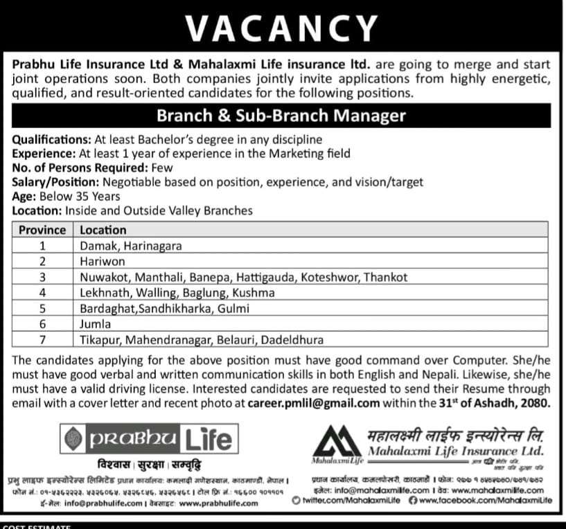 मर्जर प्रकृयामा जान लागेको प्रभु महालक्ष्मी लाइफले माग्यो कर्मचारी, असार ३१ गतेसम्म आवेदन दिन पाईने
