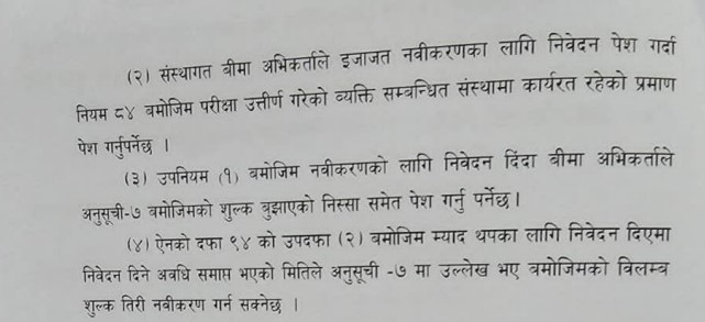 प्राधिकरणले बीमा नविकरण गराँउदा आफनो कामको सम्पूर्ण विवरण पेश गरेपश्चात् मात्रै नविकरणको सुविधा प्रदान गर्न दिने भएको छ।बीमा ऐनमार्फत नै बीमा अभिकर्ताहरुलाई बाध्ने तयारी गर्दै बीमा प्राधिकरणले अभिकर्ताले बिक्रि गरेको बीमालेख प्राधिकरणले निर्धारण गरे बमोजिमको सेवा उपलब्ध गराएको प्रमाणपत्र पेश गरेमात्रै नविकरणको सुविधा दिने भएको छ।