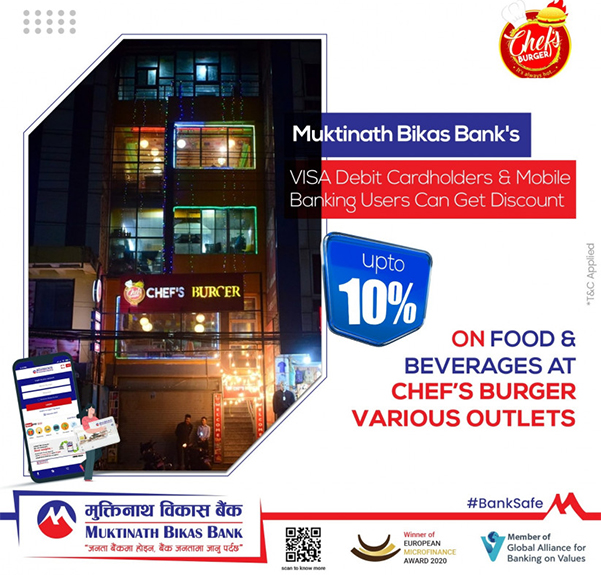 यस व्यावसायिक सम्झौतापश्चात मुक्तिनाथ विकास बैंकका भिसा डेबिट कार्डबाहक तथा मोबाइल बैंकिङ ग्राहकले सेफ्स बर्गरका विभिन्न शाखामा फुड एन्ड बेभरेज सेवामा विशेष १० प्रतिशत छुट प्राप्त गर्न सक्नेछन् ।
