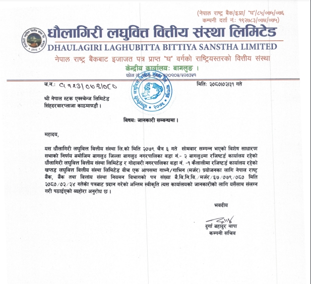 राष्ट्र बैंकद्वारा खप्तड र धौलागिरी लघुवित्तलाई मर्जरको अन्तिम स्वीकृति प्रदान
