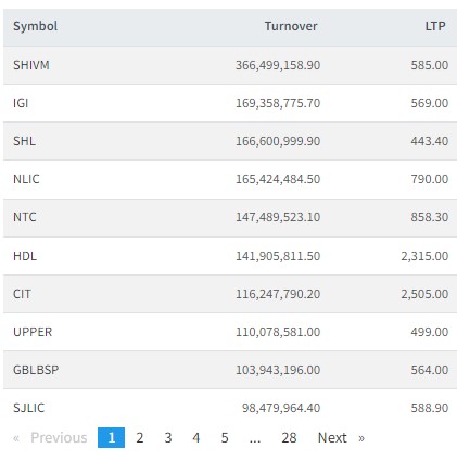 त्यस्तै, आइजीआई पु्रडेन्सियल, सोल्टी होटल, नेपाल लाइफ,नेपाल टेलिकम, हिमालयन डिष्टिलरी, सिआईटी, अपर तामाकोशी, ग्रामीण विकास लघुवित्त र सूर्या ज्योति लाइफको शेयर सर्वाधिक कारोबार भएको छ।