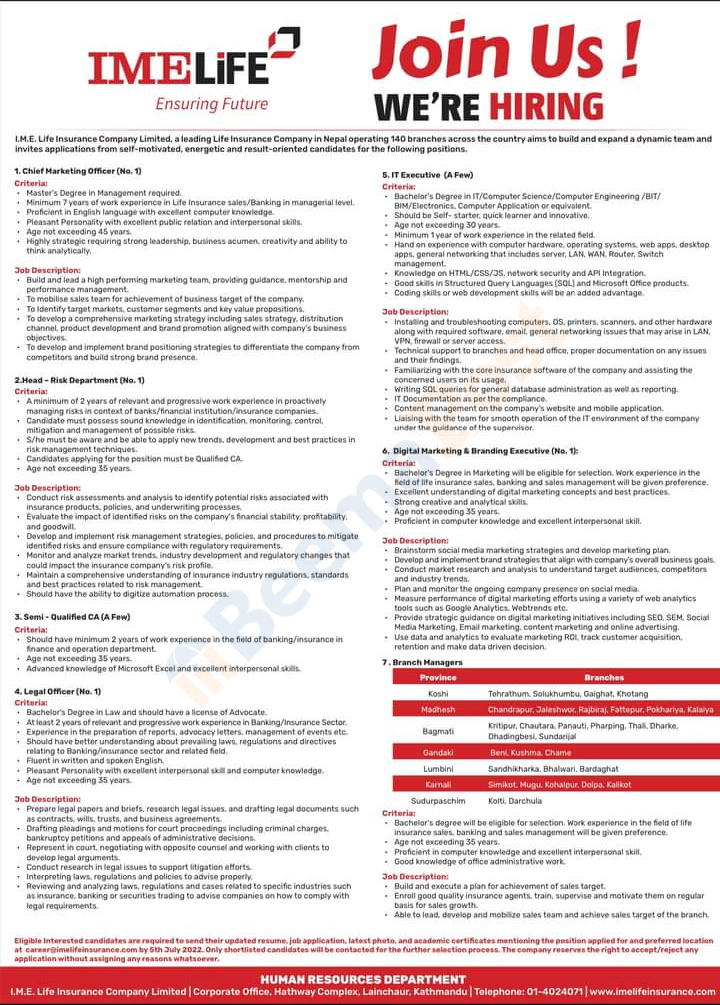 इच्छुक उम्मेदवारले असार २० गतेसम्म कम्पनीको वेभसाइट https://imelifeinsurance.com/Careers.aspx मार्फत आवेदन दिन सक्ने कम्पनीले जनाएको छ ।