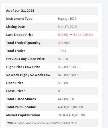 हिजोको तुलनमा भने कम्पनीको शेयर मूल्य ०।९३ प्रतिशतले घटेको छ । कम्पनीको शेयर मूल्य हिजोको तुलनामा ५ रुपैयाँ प्रतिकित्ता झरेर ५ सय ४४ रुपैयाँमा दोस्रो बजारमा कारोबार भईरहेको छ। कम्पनीको शेयर मूल्य बढेर ५६२ रुपैयाँसम्म पुगेको थियो भने यसअघि सबैभन्दा कममा ५३४ रुपैयाँसम्म कारोबार भएको थियो ।
