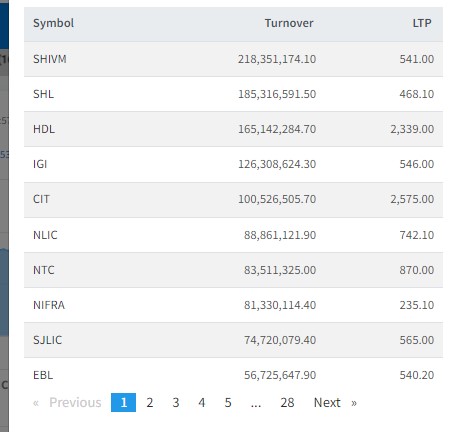 त्यस्तै, सोल्टि होटल, हिमालयन डिष्टलरी, आइएजीआई प्रुडेन्सियल, नागरिक लगानी कोष, नेपाल लाइफ , एनटीसी, निफ्रा, सूर्या ज्योति लाइफ, एभरेष्ट बैंकको शेयर सर्वाधिक कारोबार भएको छ ।