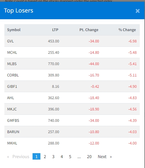 त्यस्तै, आज मेन्छियाम हाइड्रोपावर, मानुषी लघुवित्त, कर्पोरेट विकास बैंक, ग्लोबल आइएमई ब्यालेन्स्ड फण्ड लगायतका कम्पनीको शेयरमूल्य सर्वाधिक घटेको छ ।