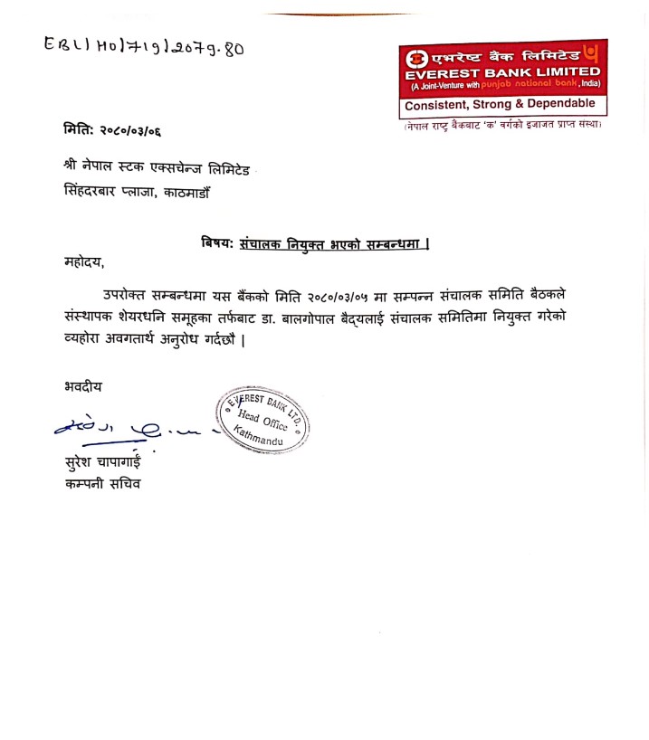 असार ५ गते बसेको सञ्चालक समितिको बैंठकले संस्थाको सेयरधनीको तर्फबाट डा.बालगोपाल बैद्यलाई सञ्चालक पदमा नियुक्त गरेको हो ।