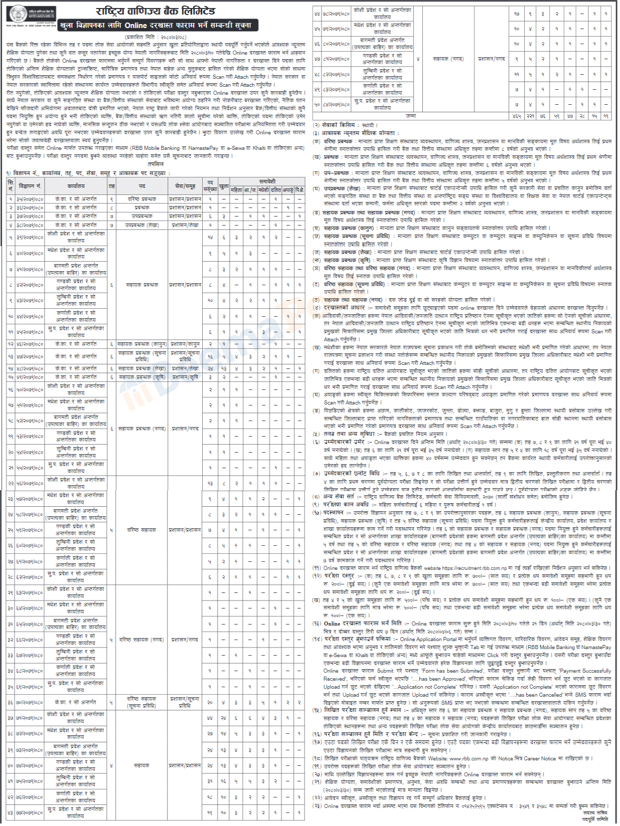 बैंकले सहायक चौथो तह देखि वरिष्ट प्रबन्धकसम्मका पदहरुमा कुल ४६५ जना कर्मचारी माग गरेको छ । जसमा खुलातर्फ २२१ जना, महिलातर्फ ७६ जना, आदिवासी जनजातितर्फ ५९ जना, मधेसीतर्फ ४७ जना, दलिततर्फ २८ जना, अपांगतर्फ १५ जना र पिछडिएको क्षेत्रतर्फ १९ जना कर्मचारी भर्ना गर्न लागिएको छ।