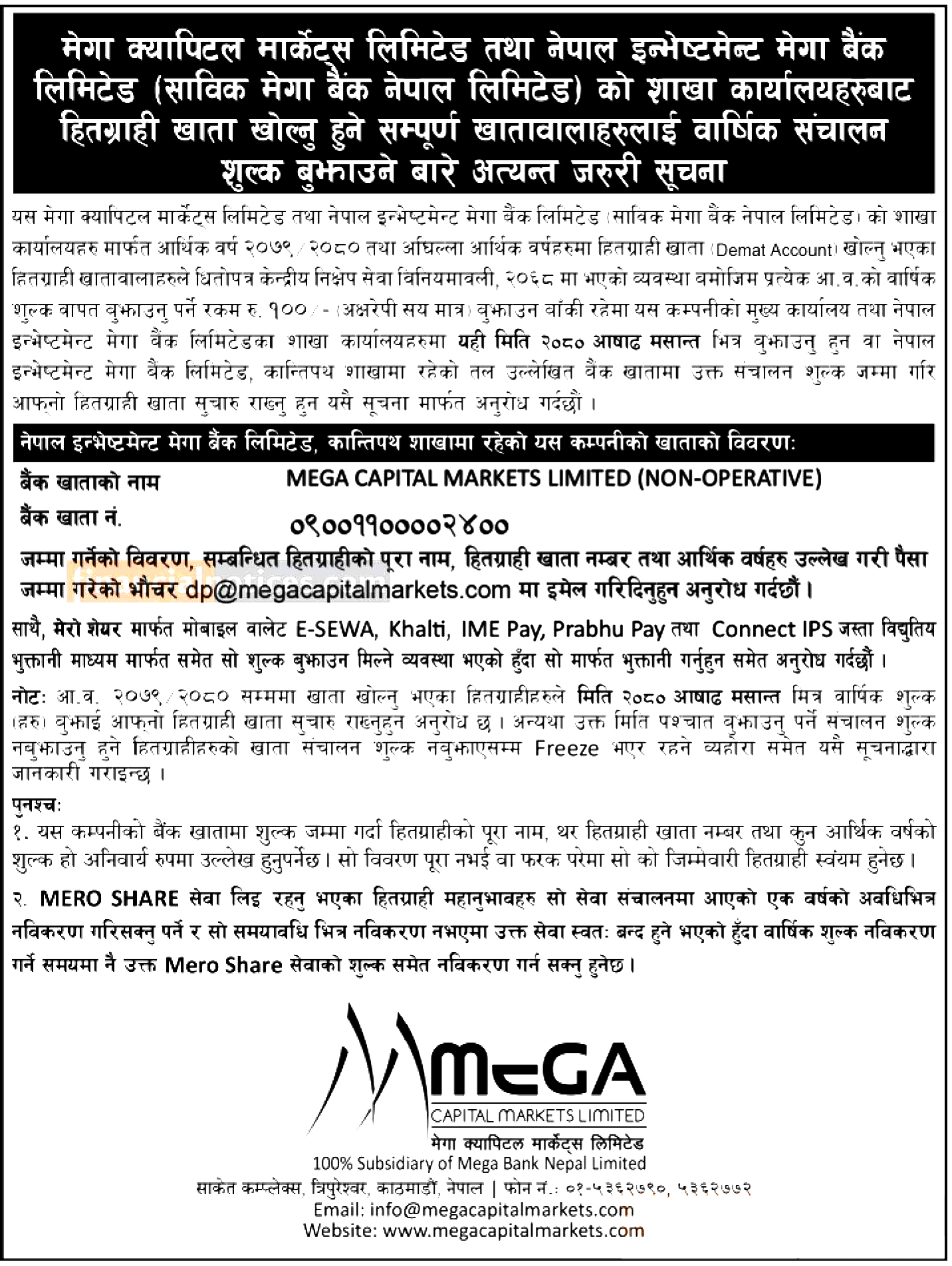 काठमाडौैं । मेगा क्यापिटल मार्केट्स लिमिटेडले हितग्राही खाताको वार्षिक नविकरण शुल्क बुझाउन आग्रह गरेको छ ।