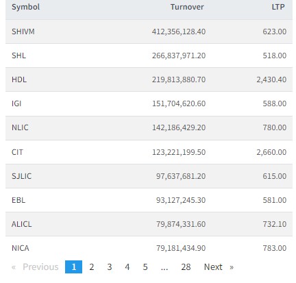 त्यस्तै, सोल्टि होटल, हिमालयन डिष्लरी, आइजीआई पु्रडेन्सियल, नेपाल लाइफ, नागरिक लगानी कोष, सूर्या ज्योति लाइफ, एभरेष्ट बैंक , एशियन लाइफ र एनआईसी एशियाको सर्वाधिक कारोबार भएको छ।