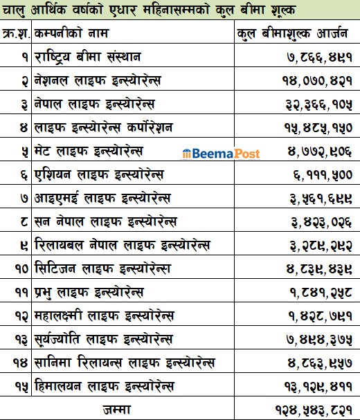 चौथौमा हिमालयन लाइफ इन्स्योरेन्स कम्पनी रहेको छ । कम्पनीले यस त्रैमाससम्मा कुल बीमा शुल्क आर्जन १३ अर्ब १२ करोड रुपैया छ ।