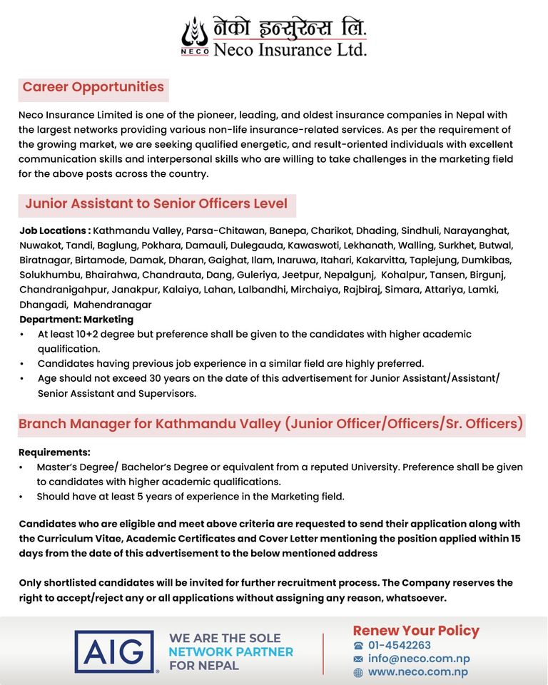 नेको इन्स्योरेन्सद्वारा सातै प्रदेशमा कर्मचारी माग, कति चाहिन्छ शैक्षिक योग्यता ?