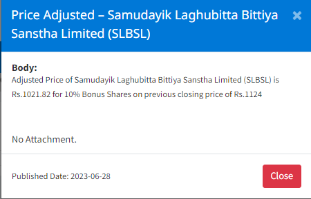 सामुदायिक लघुवित्त वित्तिय संस्थाको १० प्रतिशत बोनस सेयरपछि प्रतिइकाई १ हजार २१ रुपैंया ८२ पैसा हुने गरी मूल्य समायोजन गरेको हो ।