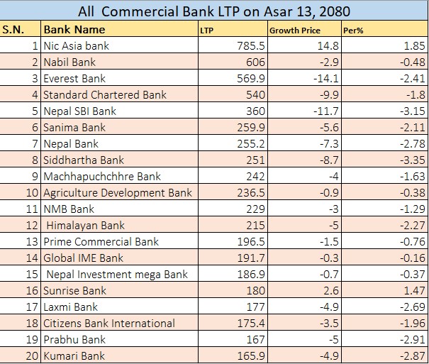 अन्तिम दिन क बर्गका बाणिज्य बैंकहरु मध्ये सबैको शेयर मूल्य घटेको छ । सबैभन्दा धेरै सिद्धार्थ बैंकको ३.३५ प्रतिशतले घटेको छ भने सनराईज बैंकको मात्रै १.४७ प्रतिशतले बृद्धि भएको छ । त्यस्तै, एसबिआई बैंक,प्रभु बैंक, नपाल बैंक, लक्ष्मी बैंक, एभरेष्ट बैंक कुमारी बैंक, र सिटिजन बैंकको शेयर मूल्य घटेको देखिएको छ ।