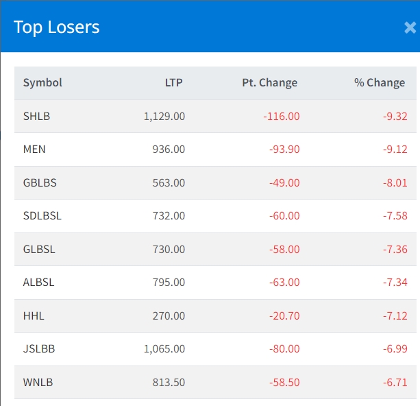त्यस्तै, माउण्टेन इनर्जि नेपाल, ग्रामिण विकास लघुवित्त, साधना लघुवित्त, गुराँस लघुवित्त, आशा लघुवित्त लगायत अन्य कम्पनीको शेयर मूल्यमा सर्वाधिक गिरावट आएको छ ।