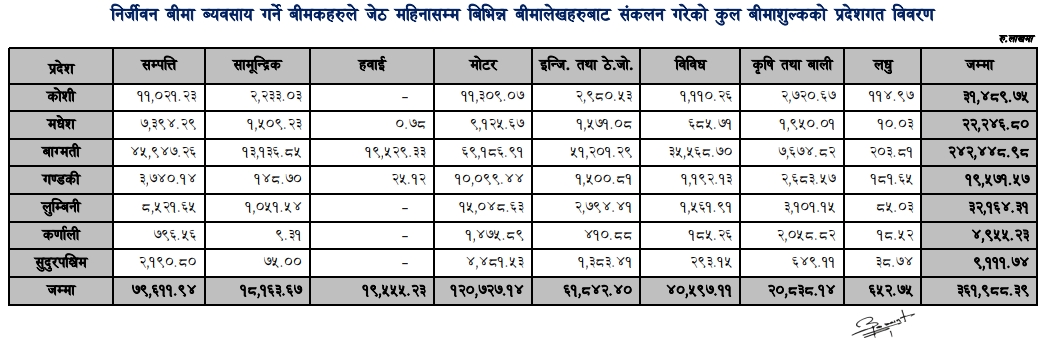 निर्जीवन बीमा कम्पनीले जेठ महिनासम्ममा बाग्मती प्रदेशबाट आर्जन गरे सबैभन्दा बढी बीमाशुल्क, अन्य प्रदेशको अबस्था कस्तो ?