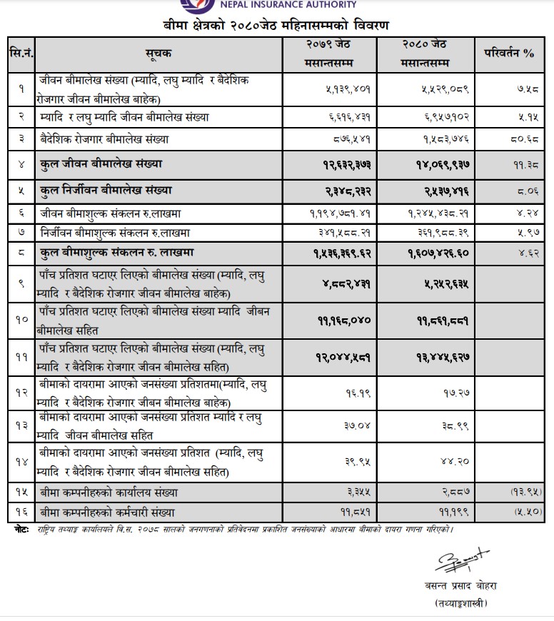 नेपाल बीमा प्राधिकरणको तथ्यांक अनुसार यस अवधिसम्ममा बीमा कम्पनीहरुको कुल व्यवसायिक रकम ४ दशमलव ६२ प्रतिशतले बढेका छ । कम्पनीहरुको कुल बीमाशुल्क आर्जन वृद्धि भएर १ खर्ब ६० अर्ब रुपैयाँ पुगेको छ।