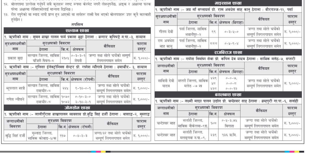 ऋणीहरुले बैंकबाट कर्जा लिई कर्जा भुक्तान नगरेको र पटक पटक सूचना जारी गर्दा समेत बेवास्ता गरेको भन्दै उल्लेखित धितोमा रहेको सम्पत्ति गोप्य शिलबन्दी मार्फत बिक्री गर्ने भएको छ ।