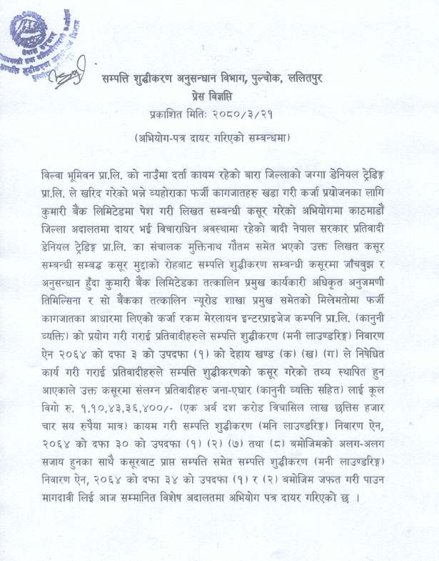 काठमाडौं । सम्पत्ति शुद्धिकरण विभागले कुमारी बैंकका भूतपूर्व सिईओ अनुजमणि तिमिल्सिना, तत्कालिन न्यूरोड शाखाका प्रमुख समेतले विल्वा भूमिवन प्रा.लि., डेनियल ट्रेडिङ र सञ्चालक मुक्तिनाथ गौतम र मेरलायन प्रा.लि समेतको मिलेमतोमा फर्जी धितो देखाएर एक अर्ब १० करोड ऋण प्रवाह भएको घटनामा सम्पत्ति शुद्धिकरण गरेको भन्दै यही असार २१ गते विशेष अदालतमा मुद्दा दर्ता गरेको छ ।