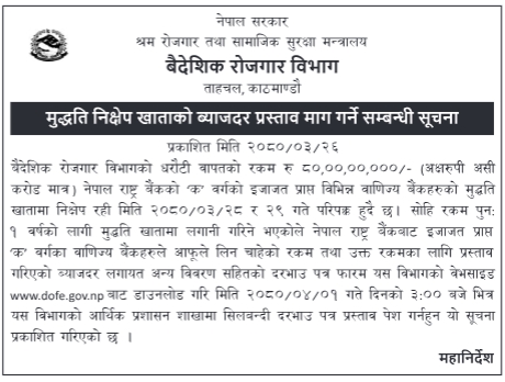 उक्त रकम लिन इच्छुक क वर्गका वाणिज्य बैंकहरुले विभागको वेभसाइटबाट दरभाउ पत्र फारम डाउनलोड गरी आफुले लिन चाहेको रकम र रकमका लागि प्रस्ताव गरिएको ब्याजदर लगायन अन्य विवरण भरि साउन १ गतेभित्र बैदेशिक रोजगार विभागको आर्थिक प्रशासन शाखामा सिलबन्दी दरभाउ पत्र प्रस्ताव पेश गर्नुपर्ने विभागले जनाएको छ ।
