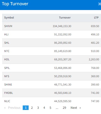 त्यस्तै, हिमालयन लाइफ, सोल्टि होटल, नेपाल टेलिकम, हिमालयन डिष्टलरी, सिद्धार्थ प्रिमियम, नेपाल फाइनान्स, शाईन रेसुङगा, फस्र्ट माईक्रो लघुवित्त र नेपाल लाइफको आज सर्वाधिक कारोबार भएको छ।