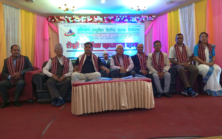 काठमाण्डौ । अभियान लघुवित्त वित्तीय संस्था लिमिटेडको तेस्रो वार्षिक साधारणसभा सम्पन्न भएको छ । कम्पनीका अध्यक्ष बाबुराम थापाको अध्यक्षतामा सभा असार २८ गते काभ्रेको पनौती–४ स्थित ताम्राकार पार्टी भेन्युमा सम्पन्न भएको हो ।