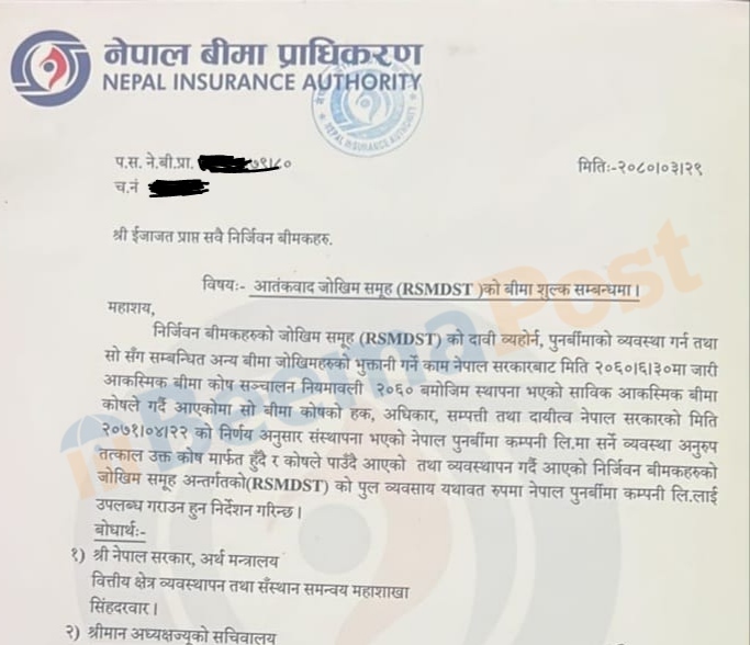 बीमा प्राधिकरणले अर्थमन्त्री डा. प्रकाशशरण महतकाे कडा निर्देशनपछि आज सबै बीमा कम्पनीकाे नाममा निर्देशन जारी गर्दै आतंकवाद जाेखिम बहन काेषकाे जिम्मेवारी नेपाल पुनर्बीमा कम्पनीलाई दिन भनिएकाे छ । प्राधिकरणले यसअघिकाे निर्णय सच्याउँदै यस्ताे निर्णय गरेकाे हाे ।