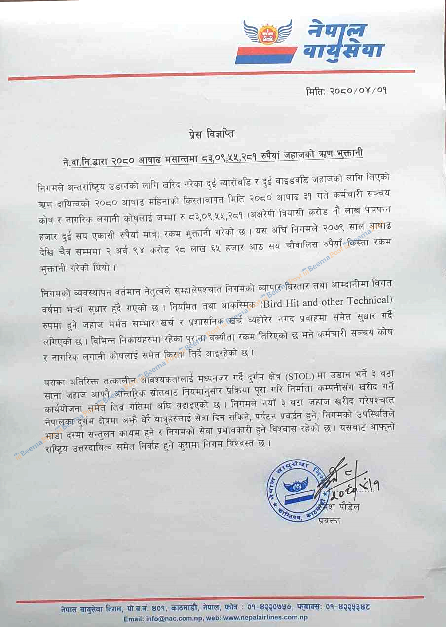 वायुसेवा निगमले आज एक सूचना जारी गर्दै अन्तर्राष्ट्रिय उडानको लागि खरिद गरेका दुई न्यारोबडि र दुई वाइडबडि जहाजको लागि लिएको ऋण दायित्वको असार महिनाको किस्ताबापत असार ३१ गते कर्मचारी सञ्चय कोष र नागरिक लगानी कोषलाई जम्मा ८३ करोड ९ लाख ५५ हजार रुपैयाँ भुक्तानी गरेको जानकारी दिएको हो ।