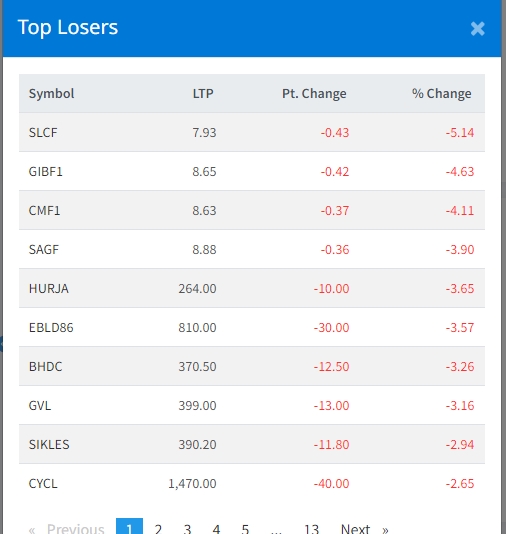 शेयर कारोबारको तेस्रो दिन आज सानिमा लार्ज क्याप फण्डको शेयरमूल्य सर्वाधिक ५।१४ प्रतिशतले घटेको छ । त्यस्तै ग्लोबल आईएमई ब्यालेन्सड फण्ड १, सिटिजन म्युचुअल फण्ड १, सानिमा ग्रोथ फण्ड, हिमालयन ऊर्जा विकास कम्पनी आदिको शेयरमूल्यमा गिरावट आएको छ ।