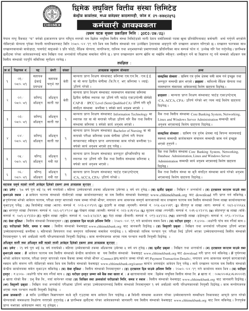 काठमाडौं । छिमेक लघुवित्त वित्तीय संस्था लिमिटेडले रिक्त रहेका विभिन्न पदहरुमा खुला प्रतियोगिता मार्फत कर्मचारी दरखास्त आह्वान गरेको छ । संस्थाले आज एक सूचना प्रकाशित गर्दै विभिन्न ६ पदहरुमा केही संख्याले कर्मचारी माग गरेको हो ।