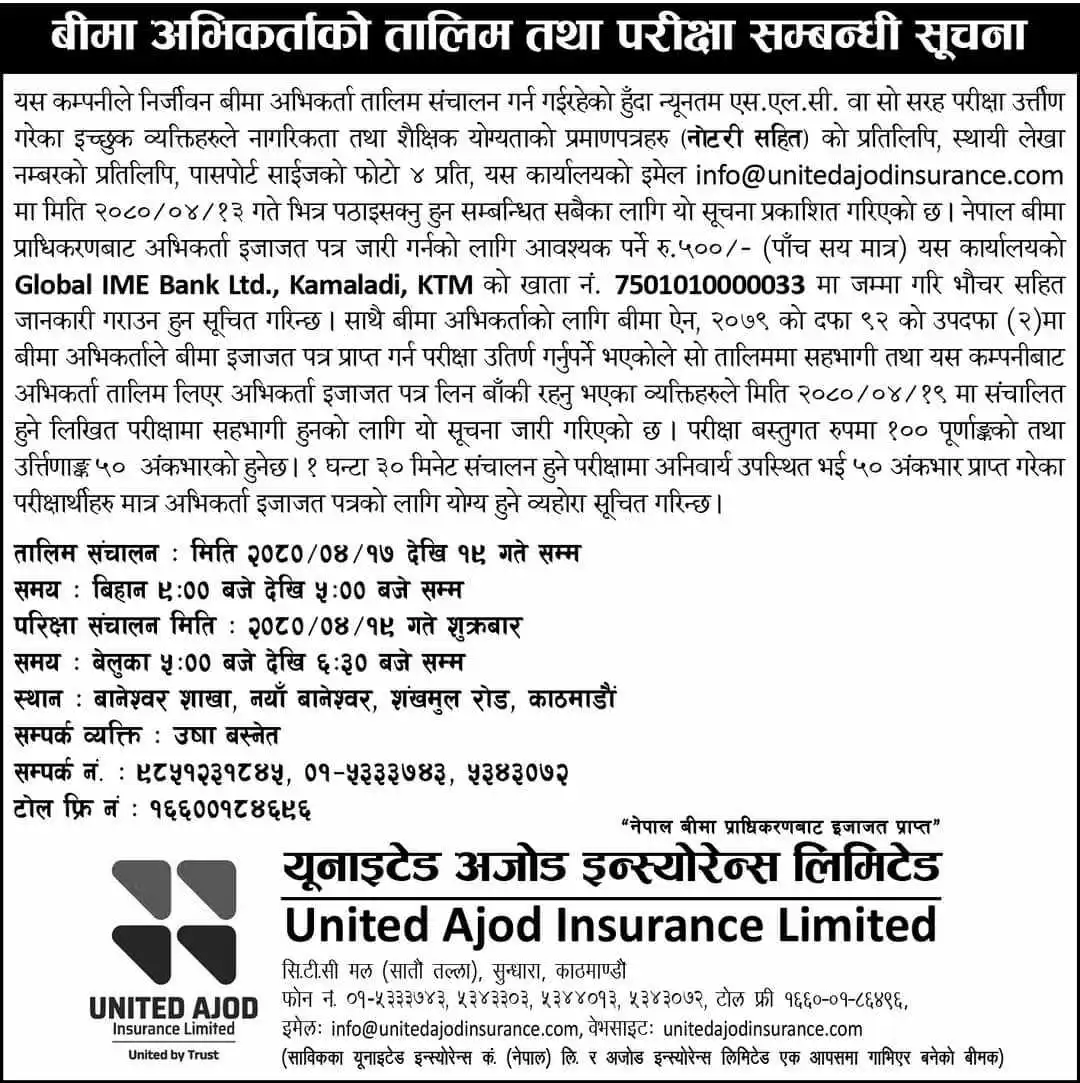 कम्पनीले साउन १७ गतेदेखि १९ गतेसम्म काठमाडौंको बानेश्वर शाखा, नयाँ बानेश्वर, शंखमुल रोडमा बीमा अभिकर्ता तालिम सञ्चालन गर्ने भएको छ । सो तालिममा सहभागि हुनको लागि कम्तिमा एसएलसी तह उतिर्ण गरेको शैक्षिक योग्यता हुनुपर्ने कम्पनीले जनाएको छ ।