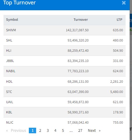 त्यस्तै, सोल्टि होटल, हिमालयन लाइफ, सोल्टि होटल, ज्योति विकास बैंक, हिमालयन डिष्टलरी,साल्ट टे«डिङ, कुमारी बैंक, युनाईटेड अजोड, नेपाल लाइफ इन्स्योरेन्सको शेयर टप १० को लिष्टमा कारोबार भएको छ।