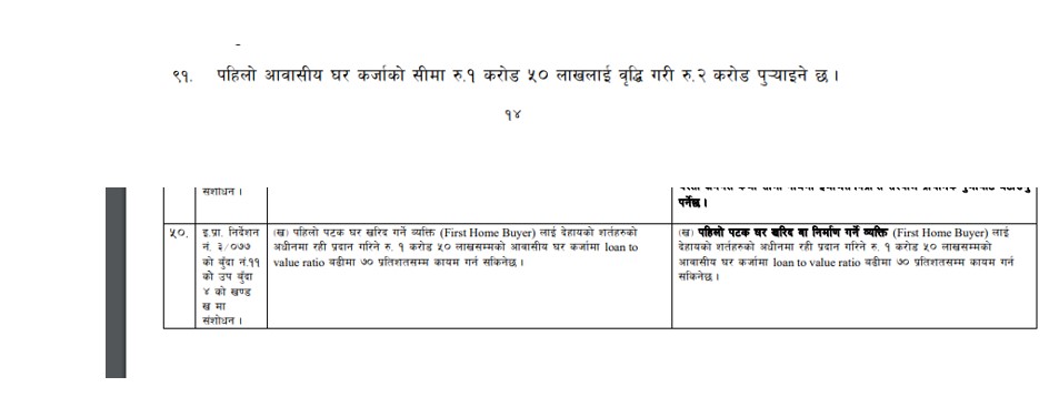 नयाँ व्यवस्था अनुसार अब बैंकले तोकेको ब्याजदरमा पहिलो पटक घर खरिद गर्नेलाई जग्गा तथा घरको कूल मूल्याङ्कनको ७० प्रतिशतसम्म ऋण दिनुपर्नेछ ।
