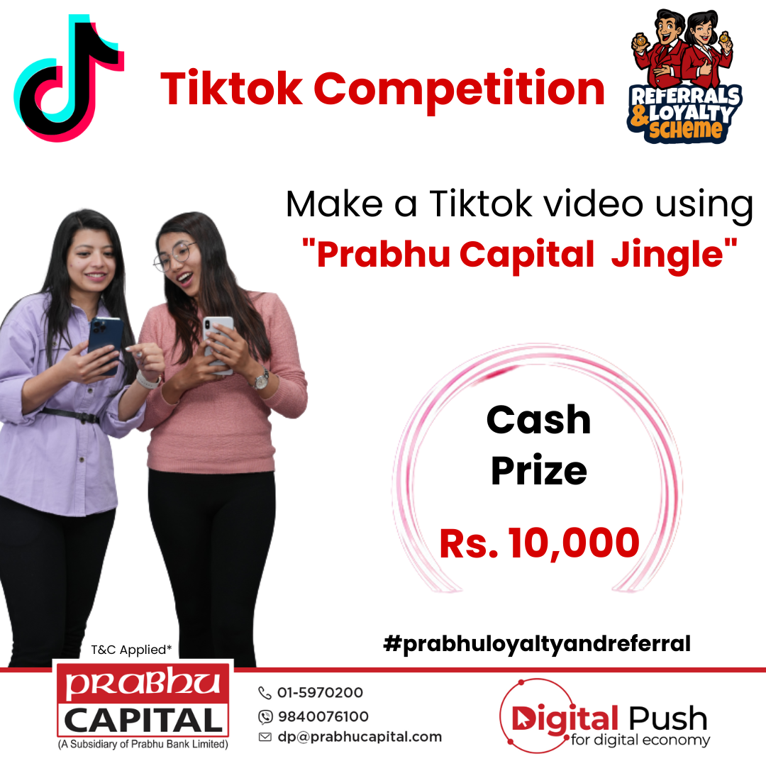 यस टिकटक कम्पिटिसन अन्तर्गत सहभागीहरुले प्रभु क्यापिटल लिमिटेडको टीकटक अकाउ्रन्टमा राखिएको जिङगलको ओर्जिनल साउण्डमा टिकटक बनाई Hashtag#prabhuloyaltyandreferal पोष्ट गर्नुपर्ने हुन्छ । सबै भन्दा धेरै लाइकको आधारमा विजेता छनौट गरिने र विजेताले रु १०,००० जित्न सकिने क्यापिटलले जनाएको छ ।