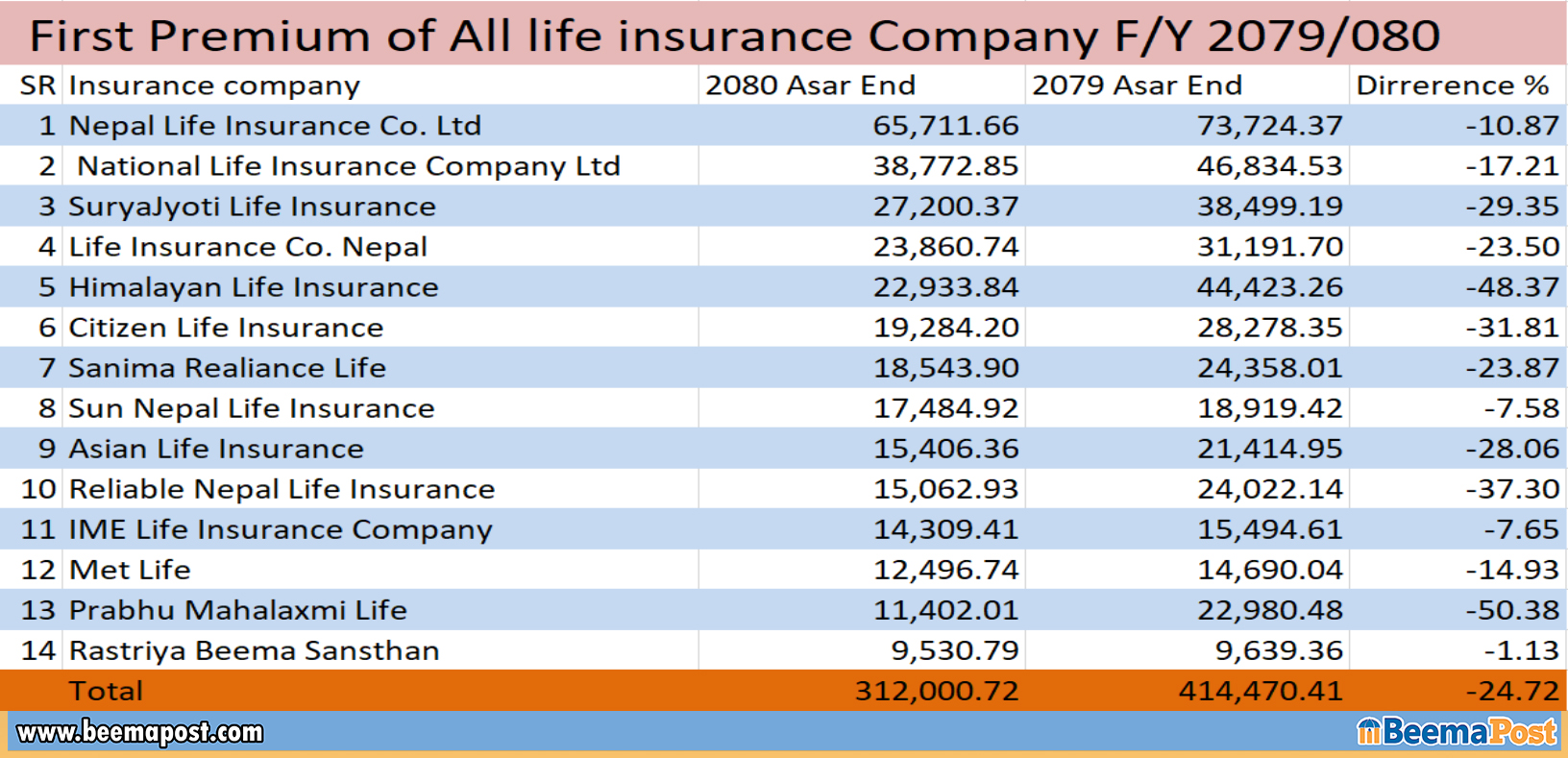 नेपाल बीमा प्राधिकरणबाट प्रारम्भिक रुपमा प्राप्त आव २०७९।०८० को तथ्याङ्क र अघिल्लो आव २०७८।०७९ को तथ्याङ्क विश्लेषण गर्दा असार मसान्तसम्ममा कुनै पनि जीवन वीमा कम्पनीहरुले नयाँ बीमा व्यवसाय बृद्धि गर्न सकेका छैनन् । १४ जीवन बीमा कम्पनीहरुको प्रथम बीमा शुल्क २४.७२ प्रतिशतले घटेको छ ।