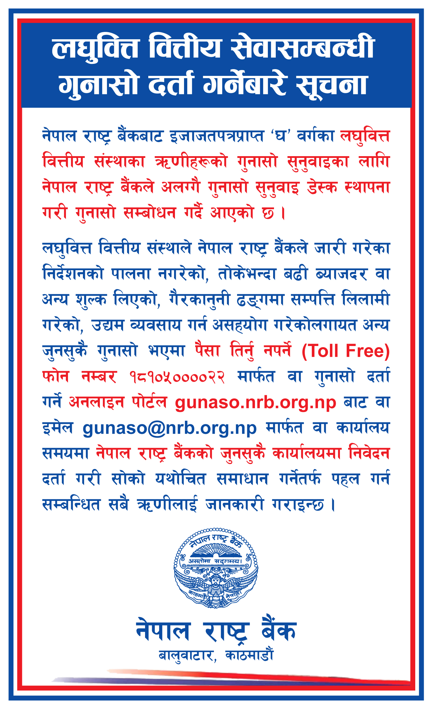 लघुवित्त पिडितहरुको आन्दोलन चर्किदै गएको उग्र रुप लिन लागेसँगै केन्द्रिय बैंकले यस्तो सूचना जारी गरेको छ। राष्ट्र बैंकले पैसा तिर्नु नपर्ने नम्बर १८१०५००००२२ मार्फत गुनासो दर्ता गर्न र राष्ट्र बैैंकको इमेल वा कार्यालय समयमा निवेदन दर्ता थरी सोको यथोचित समाधान गर्नेतर्फ पहल गर्न सम्बन्धित सबै ऋणीहरुलाई आग्रह गरेको छ।